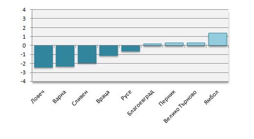 Сред добре представящите се открояват относително малки, курортни общини като nХисаря (3 204 лв.), Приморско (2 852 лв.) и Созопол (2 463 лв.). Костинброд също прави впечатление със своите 3 419 лв. на човек. Най-слабо усвояване на средства се наблюдава при общините Грамада (0 лв. на човек), Ковачевци (0 лв.), Алфатар (2 лв.), Симеоновград (4 лв.) и Невестино (5 лв.). Общините Грамада и Ковачевци нямат нито един сключен договор, като първата е подала едва две проекти предложения, които са били отхвърлени.