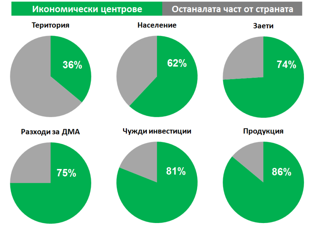 Като „икономически центрове” анализът на ИПИ определя водещите в икономическо отношение общини (ядра) в страната и техните прилежащи периферии. Значимостта на тези центрове за развитието на икономиката на страната е безспорно. Въпреки че заемат едва 36% от територията, те съсредоточават близо 75% от работещите лица и инвестициите в дълготрайни материални активи (ДМА) и над 80% от чуждестранните инвестиции и общата произведена продукция.
