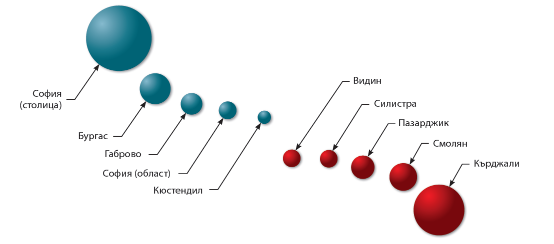 Забележка: Разликите в диаметрите показват мащаба на разликите между областите.