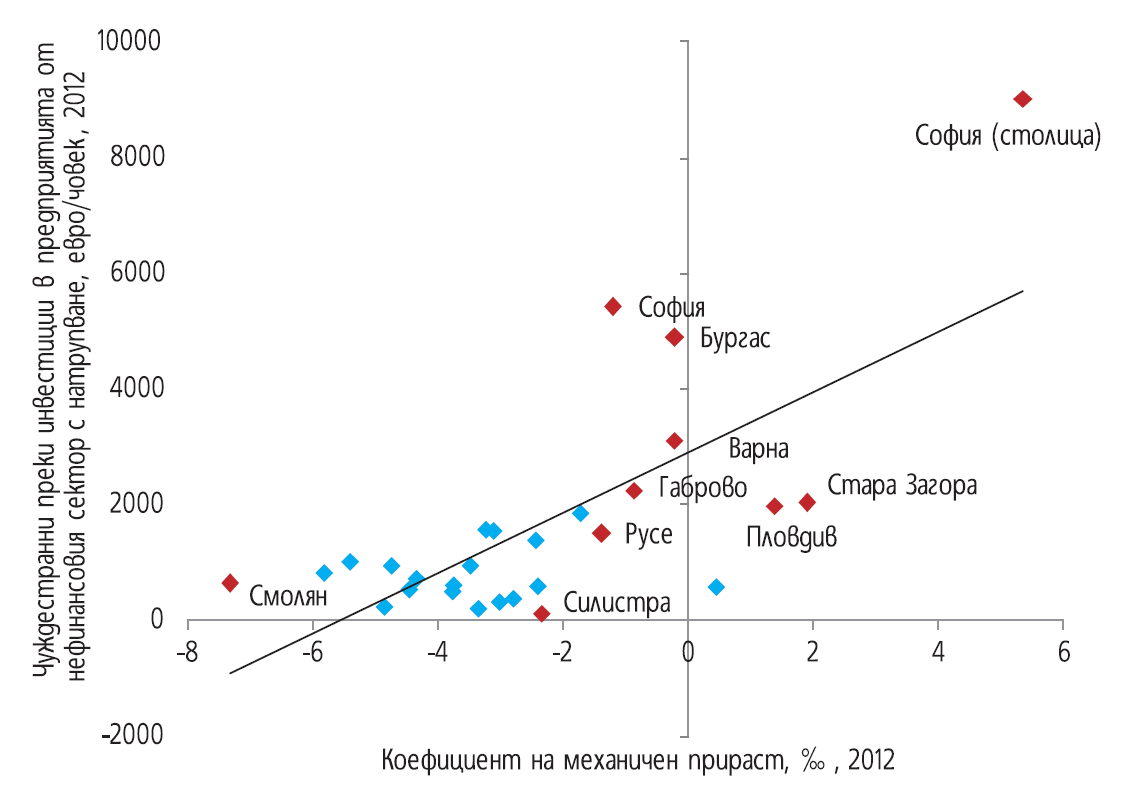 Фигура 9: Връзка между коефициента на механичен прираст и преките чуждестранни инвестиции в предприятията от нефинансовия сектор с натрупване за 2012 г. по области