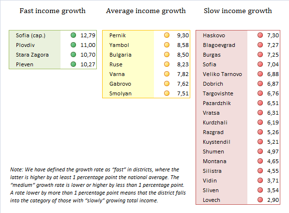 The statistical effect of the significant average annual rate of increase of income in the capital, together with the large and growing number of its population, is that in the period 2004-2013 there are only six districts in the entire country in which the average annual rate of income level increase is faster than the national average. Apart from Sofia (cap.) these are Plovdiv, Stara Zagora, Pernik, Pleven and Yambol. In the other 22 districts of the country the annual average rate of household income increase is lower than the national average, despite the fact that income levels themselves are higher than the ones in some of the before mentioned six districts.