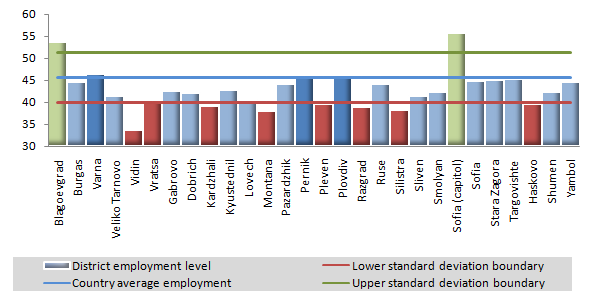The main factor for this process is the economic and demographic development of Sofia (capital). In the pre-crisis period the average employment in the country was rising because of the new jobs created in the capital. Employment in certain smaller districts such as Dobritch, Pazardzik, Smolyan and Yambol also rose rapidly before 2008, but a main reason for the latter is the drop in overall population in these regions as well as the small employment base in the beginning of the period. The effect of the increase of employment in these districts on the country average is quite negligible.